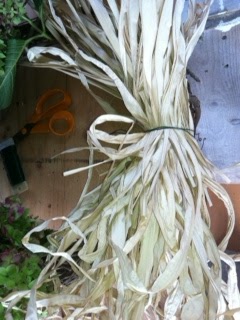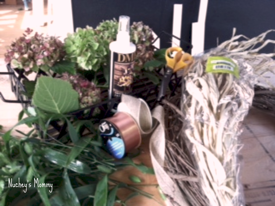 You can use silk flowers also from the craft store. For this wreath, I tied (with craft wire) the lower dried long pieces that I had in my “fall bin”.