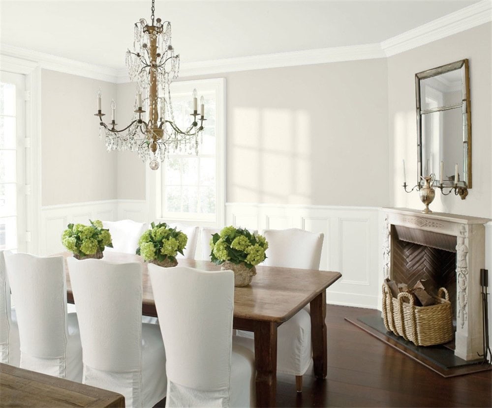 What to avoid: whites with strong yellow undertones like Simply White or Snowfall White. The yellow can clash with Pale Oak’s subtle pink undertone and make both colors look slightly off. You’ll notice it immediately if you sample them side by side.